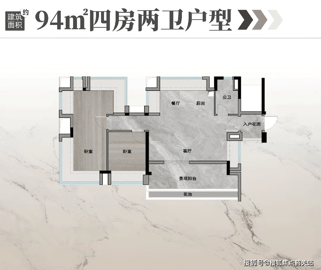 户型预留了270度双边采光边厅,建面约94㎡四房户型的最大特点是高度,该户型极大降低了项目标上车压力,
